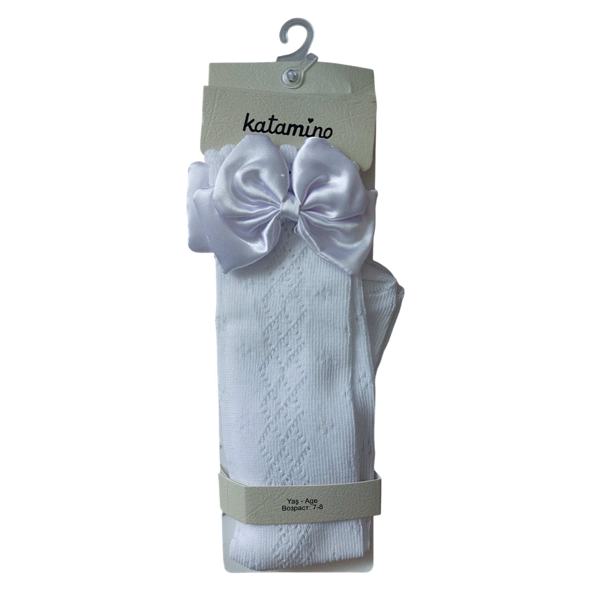 We present charming knee socks for girls in white , decorated with a subtle bow on the side. These elegant knee socks from the renowned manufacturer Katamino are the perfect addition to summer stylings. They are made of soft and pleasant to the touch fabric, guaranteeing comfort of wearing all day long. Their universal size perfectly adapts to the shape of the legs, and the delicate white color makes them match any elegant creation. Perfect for spring and summer walks.