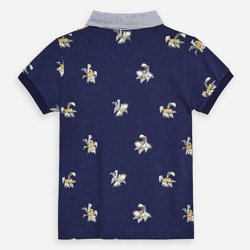 Children's cotton sports polo with short sleeves in a tiger print with a collar boy Mayoral from the Mini boy collection from the spring summer season product code 3146 color 14 navy blue. Children's clothing.
