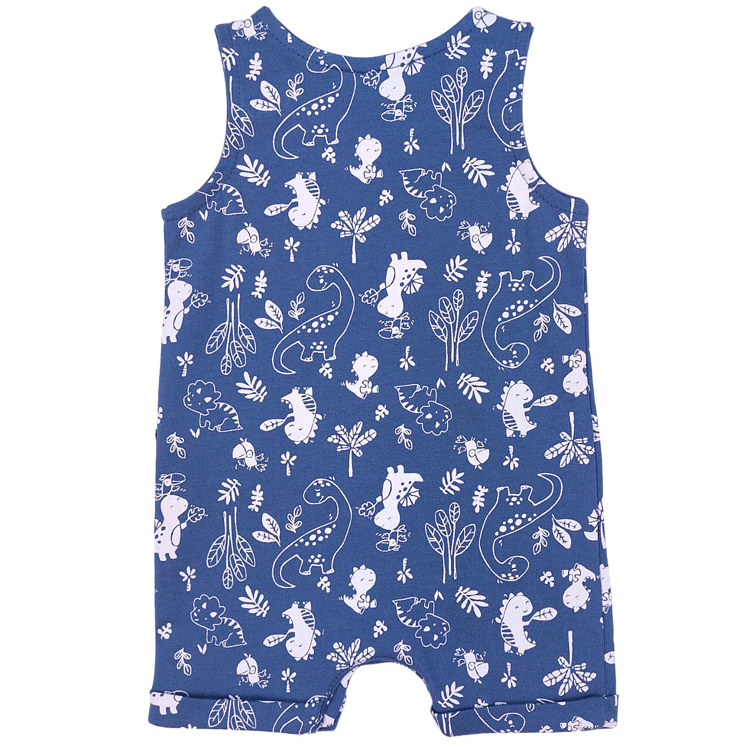 The blue romper is decorated with delicate, white patterns of dinosaurs and plants. This unique pattern is not only fashionable, but also adds a childlike charm to the outfit. Dinosaurs are a favorite motif of many toddlers, which makes this romper the perfect choice for everyday styling.