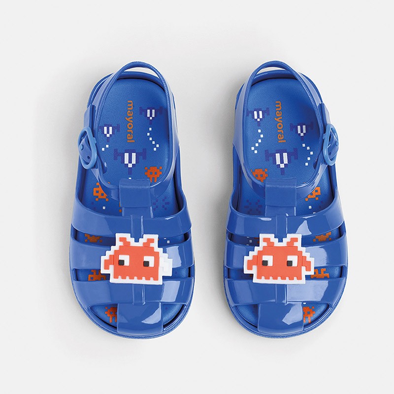 These charming sandals from the renowned manufacturer Mayoral are an absolute must-have for every boy on warm summer days. They are characterized by an intense navy blue color, which fits perfectly into children's fashion and matches various styles. Additionally, their unique look is made more attractive by the orange application referring to classic games, which will certainly appeal to every little fan of pixel fun!
