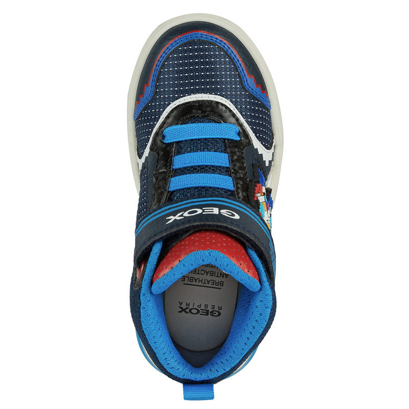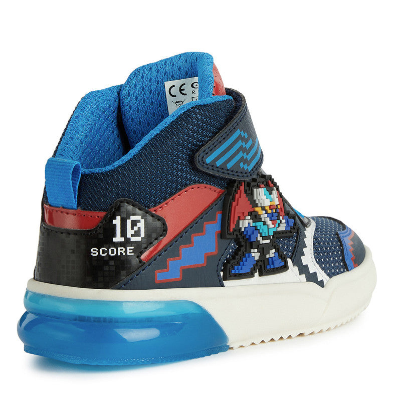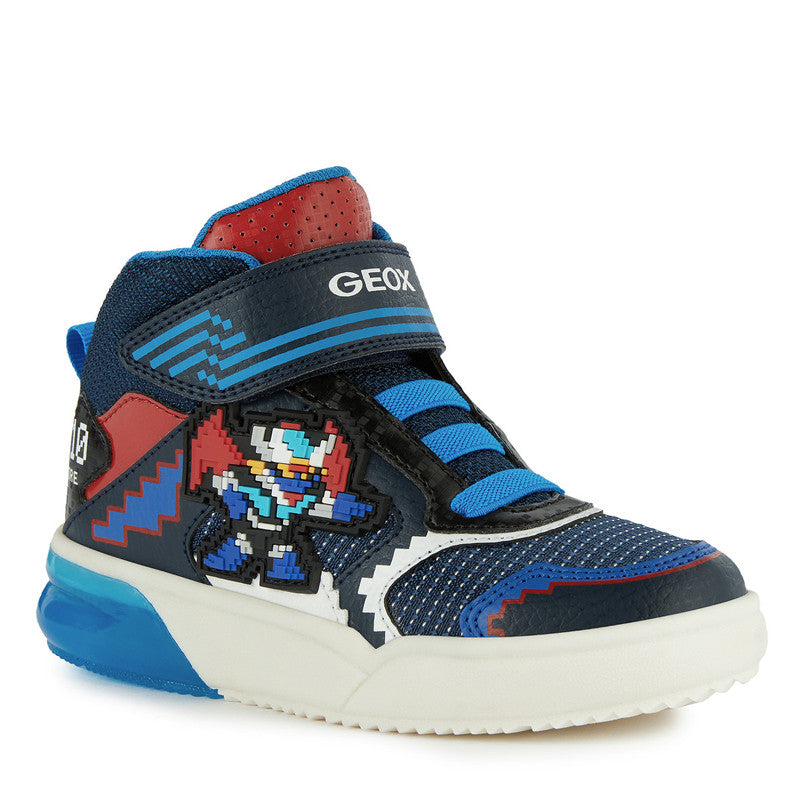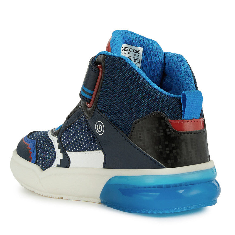 Glow sneakers for boys Geox J269YB-0FUFE-C0693 color NAVY/LT BLUE are the perfect footwear for young fans of modern trends and computer games. These unique sneakers, available in navy blue with light blue and red accents, have been designed with comfort, style and functionality in mind.