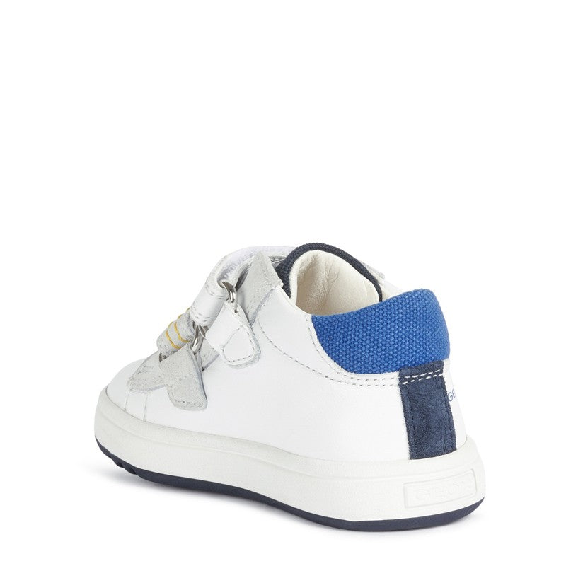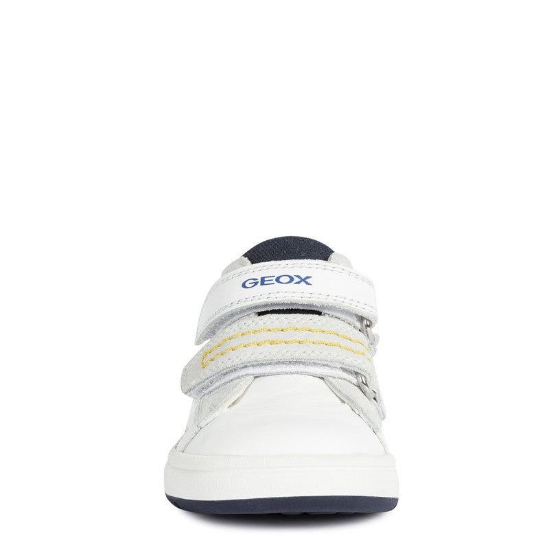 Geox shoes are known for their innovative solutions and high-quality workmanship. This model is a combination of exceptional comfort and a modern look. White sneakers with contrasting accents in navy blue and yellow look very fashionable and will be a perfect complement to your child's everyday styling. Additionally, the original bulldog print makes the shoes have a unique character that will certainly appeal to boys.