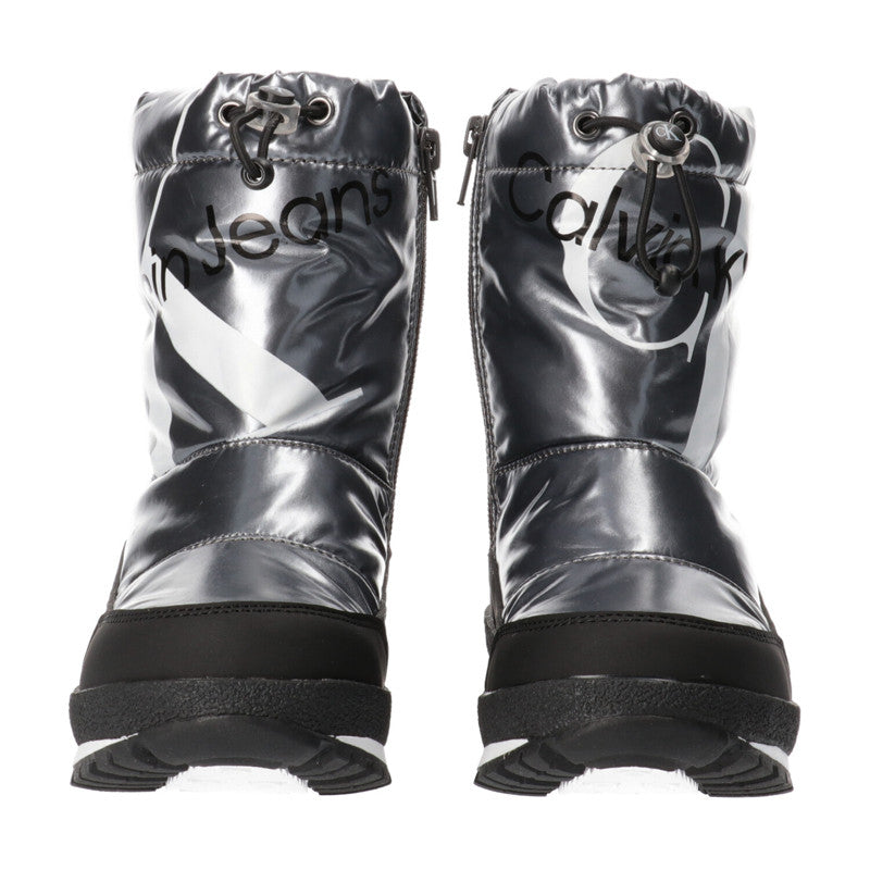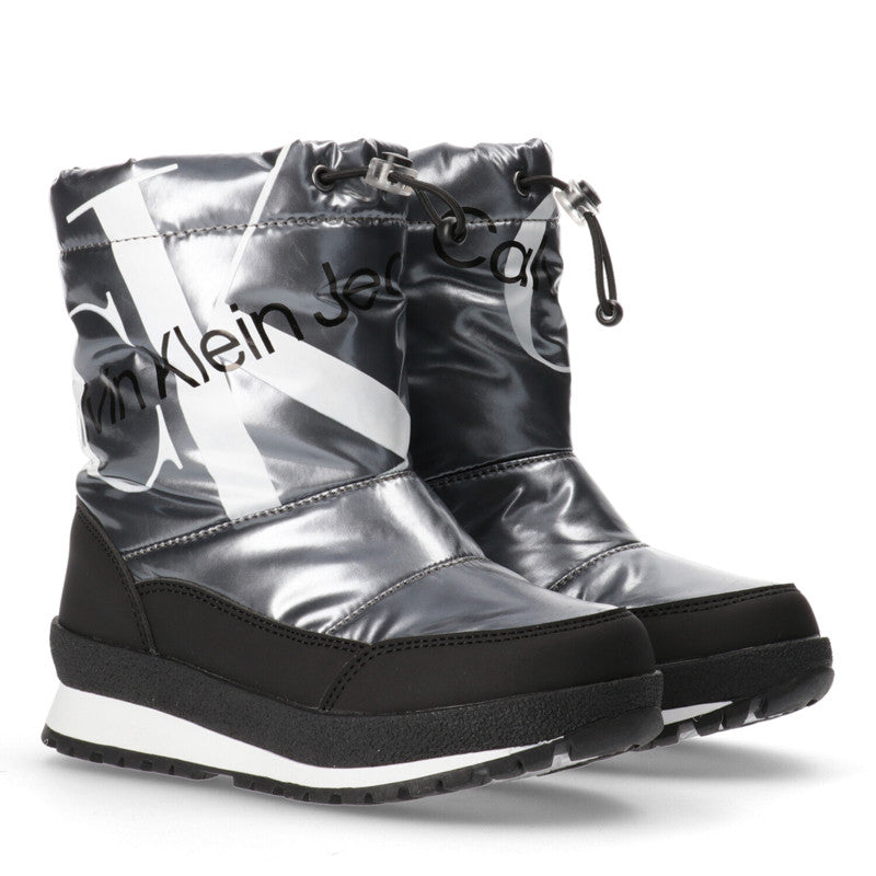 These trendy Calvin Klein snow boots for kids combine modern style with functionality, creating the perfect footwear for the winter months. They stand out with a metallic silver finish, which gives them a unique, futuristic look. The large "CK Calvin Klein" logo placed on the upper attracts the eye and adds to the shoes the characteristic style of this famous brand.