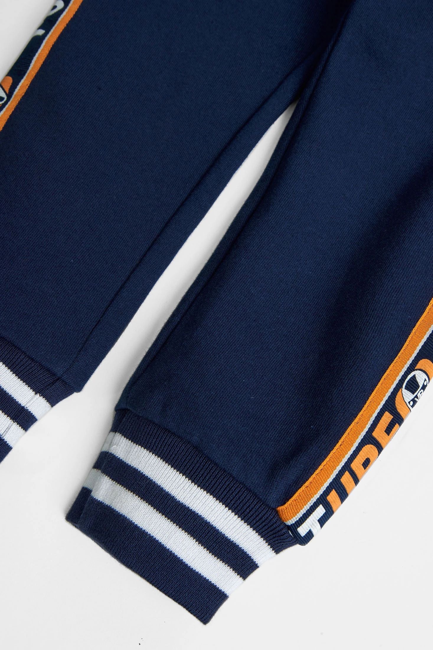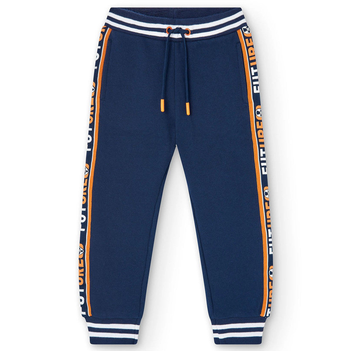 Special attention should be paid to the distinctive details, such as the elastic waistband with a drawstring and decorative stripes, which add character to the whole. The striped belt is an accent that gives the pants a sporty look, and the additional drawstrings increase the possibility of adjustment, which allows for a perfect fit to the child's figure. The side stripes with the inscription "Future" in a shade of orange are a distinctive addition that emphasizes the originality of this model. The combination of navy blue with contrasting orange details makes these pants a unique wardrobe element that perfectly fits the latest clothing trends for children.
