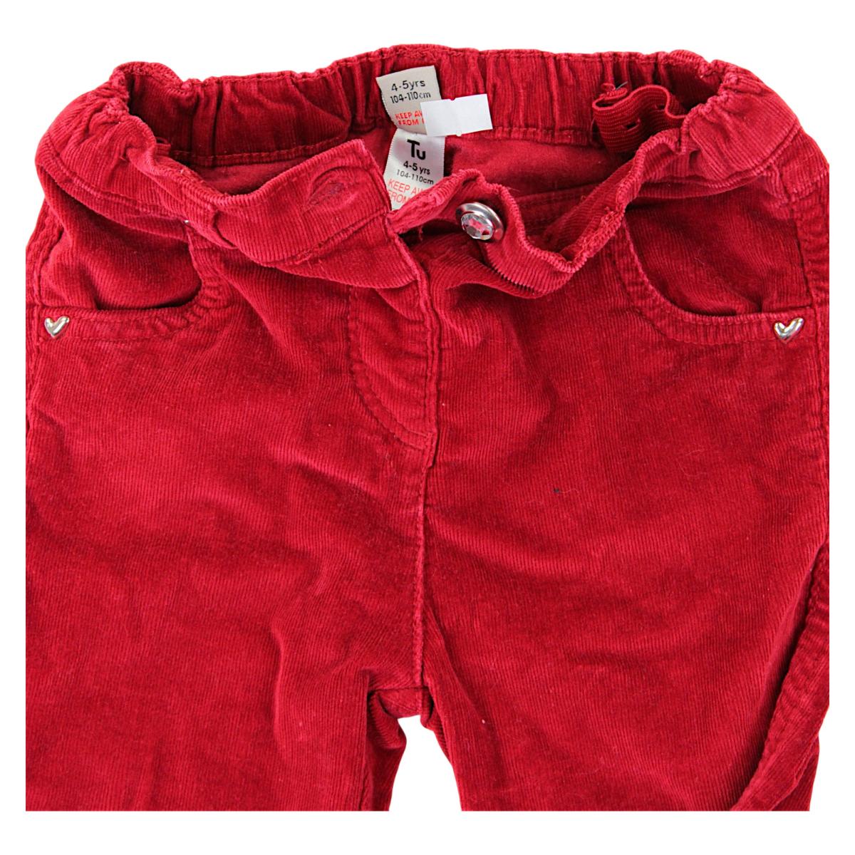 We present red pants for girls that combine style and functionality. These pants have an elastic waistband , making them easy to put on and take off, which is especially important for young children. The front of the pants is decorated with embroidered hearts on the knees, giving them a unique touch, while the interesting finish and material make them comfortable to wear. The back is simple, with two pockets perfect for storing small items. The ankle-length pants make them the perfect complement to many outfits. The button closure adds elegance, and the fashionable color makes them suitable for both preschool and various other occasions. They're worth having in a child's wardrobe.