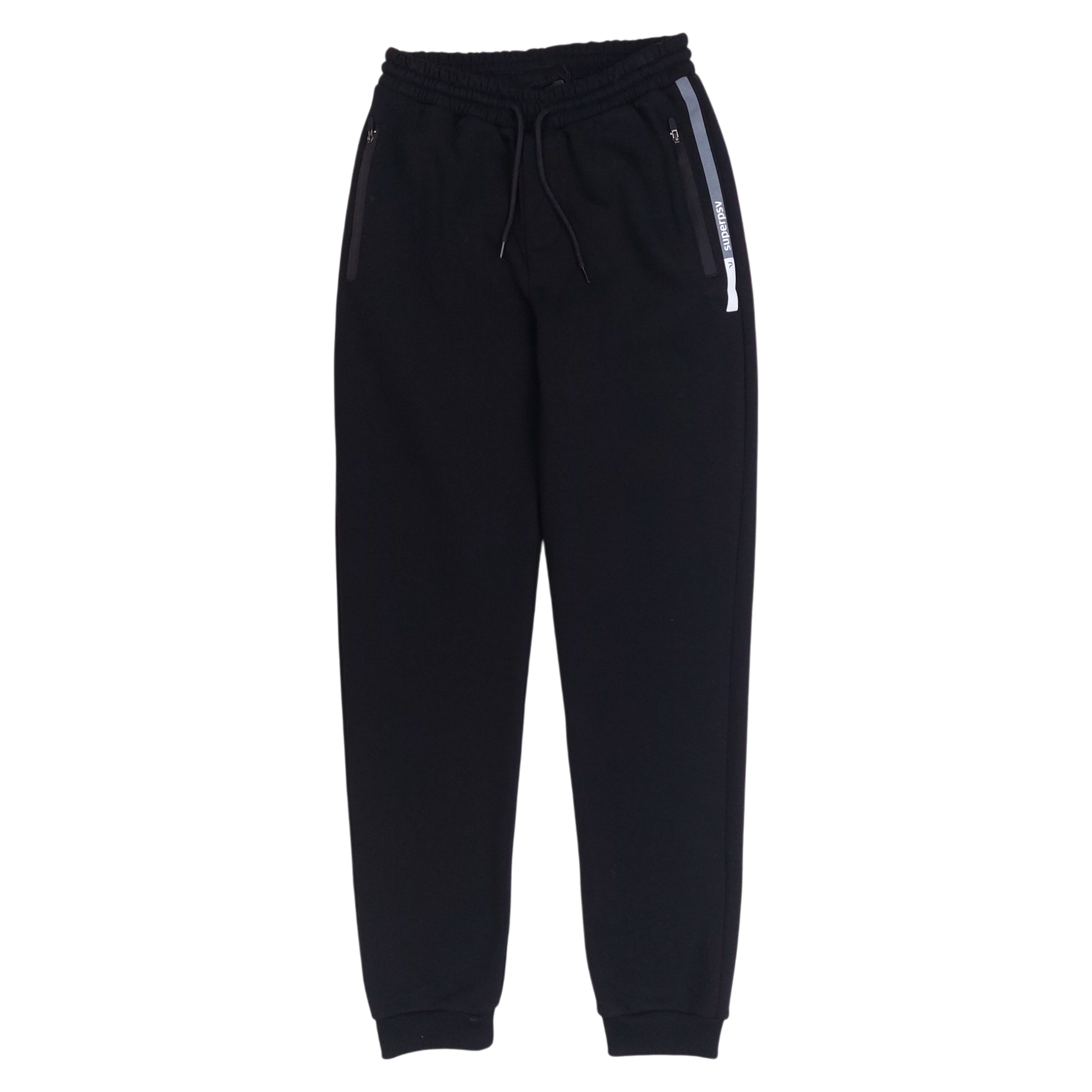 Warm black sweatpants for boys , perfect for the autumn-winter season. They have elastic bands at the waist and legs and a drawstring at the waist for a better fit. The pants are equipped with pockets with a zipper , decorated with a stylish stripe in shades of grey and a logo. Comfortable and functional, they provide comfort on colder days.