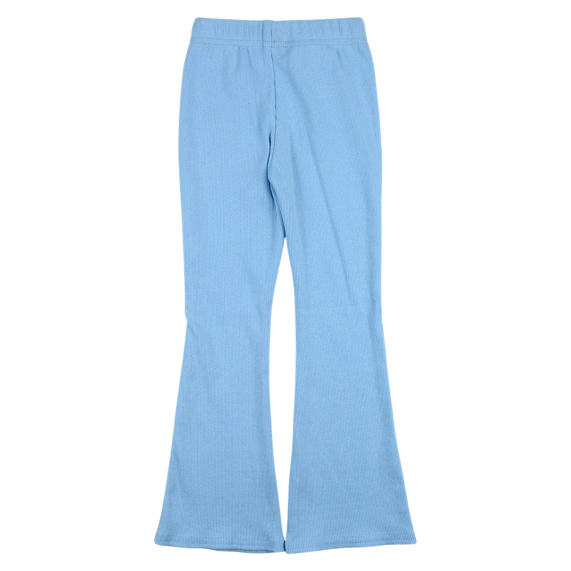 Girls' flared trousers in blue made of soft material with a ribbed texture. Perfect for the spring-summer season, these trousers offer a stylish and comfortable look. They have an elastic waist, so they can easily adjust to the figure. The lack of pockets and zippers emphasize the minimalist design, and the wide legs add a fashionable character.