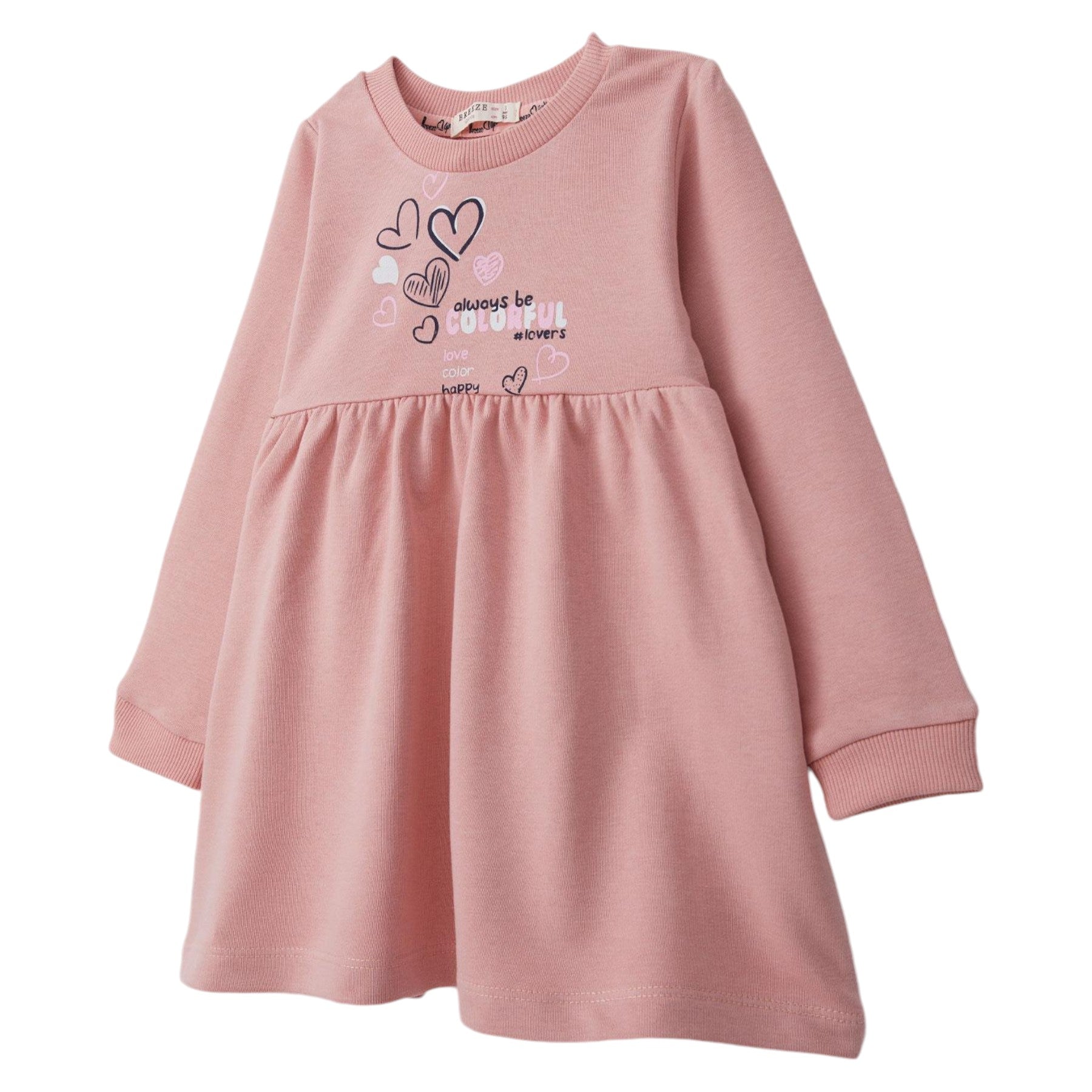 The design of the dress is very girly and subtle, decorated with heart prints and a text motif, which adds lightness and a cheerful character. The sleeves are long, which provides additional protection against the cold, and the loose cut guarantees freedom of movement during everyday activities. The bottom of the dress is slightly flared, which makes it look beautiful when walking or playing.