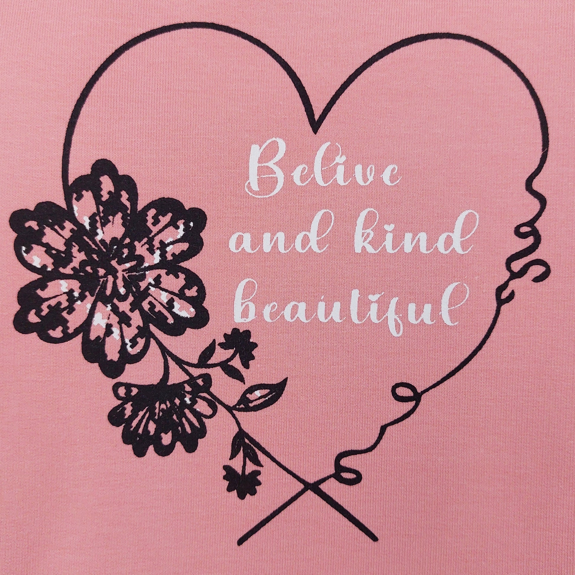 Girly everyday dress in powder pink , perfect for the fall-winter season. The charming design combines a top in the form of a sweatshirt with a decorative heart print and the inscription "Believe and kind beautiful", and a lower part with a ruffle in a delicate heart pattern. The dress has long sleeves , is comfortable, without pockets or fasteners, put on over the head.