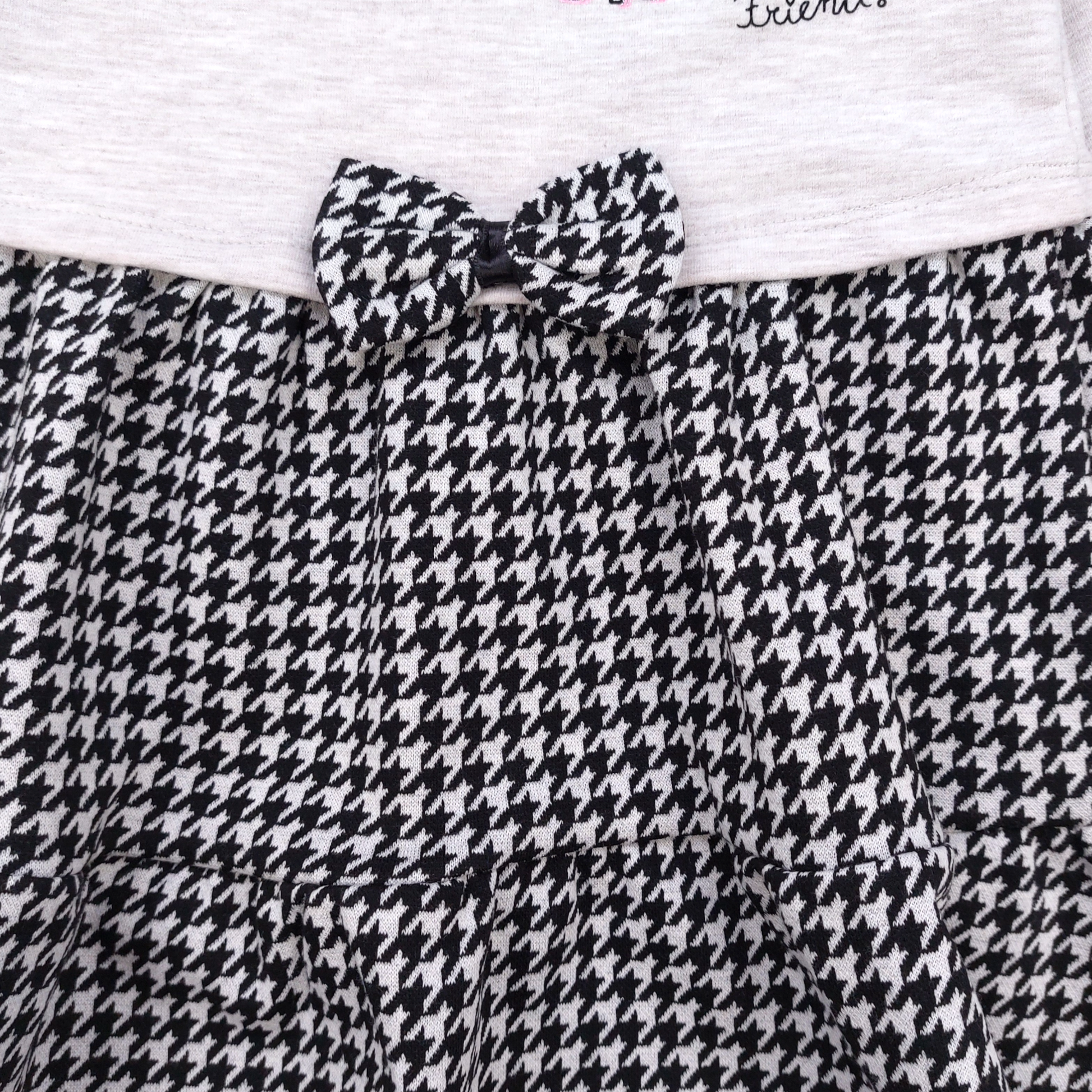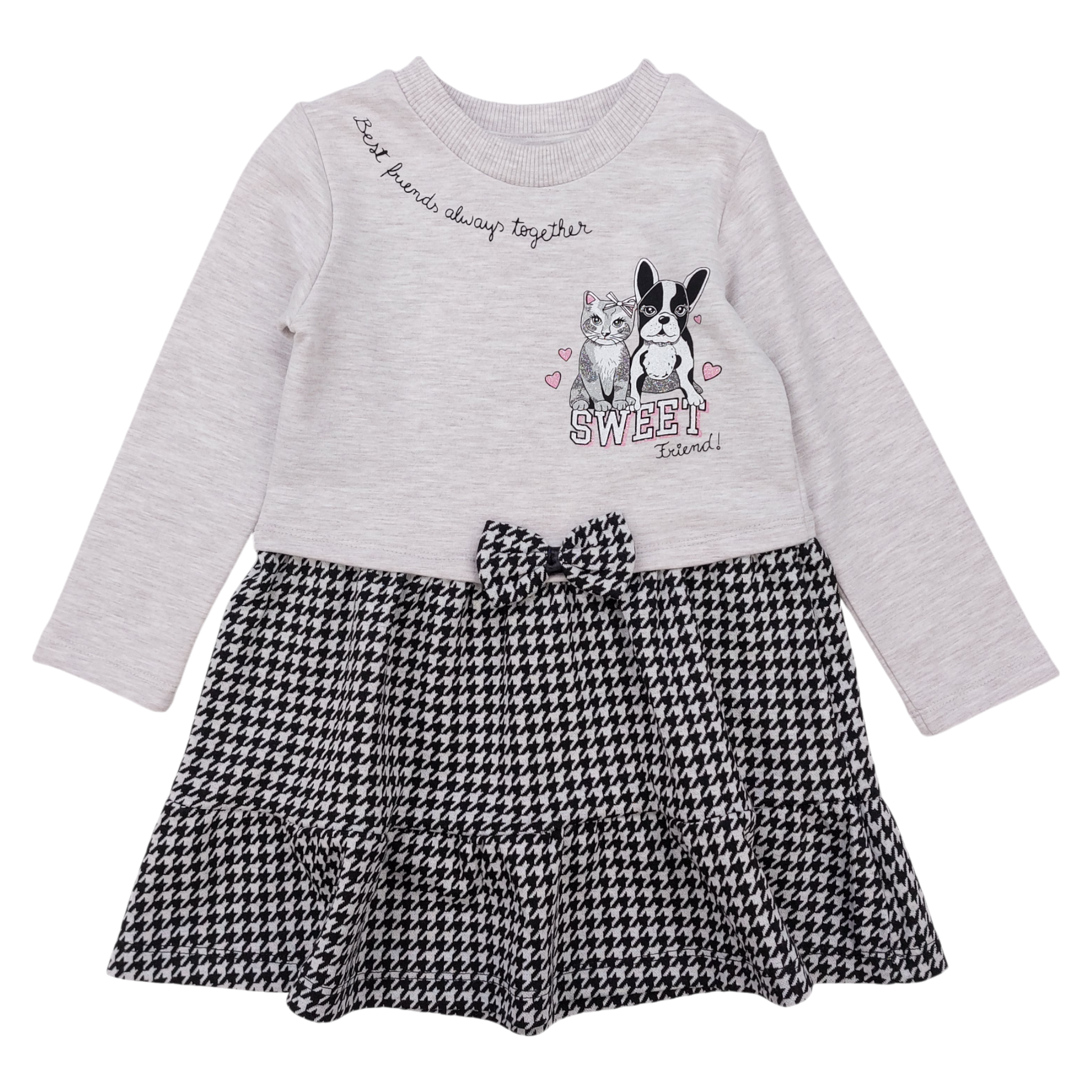 A lovely dress for a girl, perfect for everyday outings, with a unique dog and cat motif. The dress has long sleeves, and its upper part is in beige with a delicate print of friendly animals and the inscription "Best friends always together". The lower part of the dress is decorated with a houndstooth pattern, which adds style and elegance. The bow at the waist also adds charm, perfectly emphasizing the girlish character of this outfit.