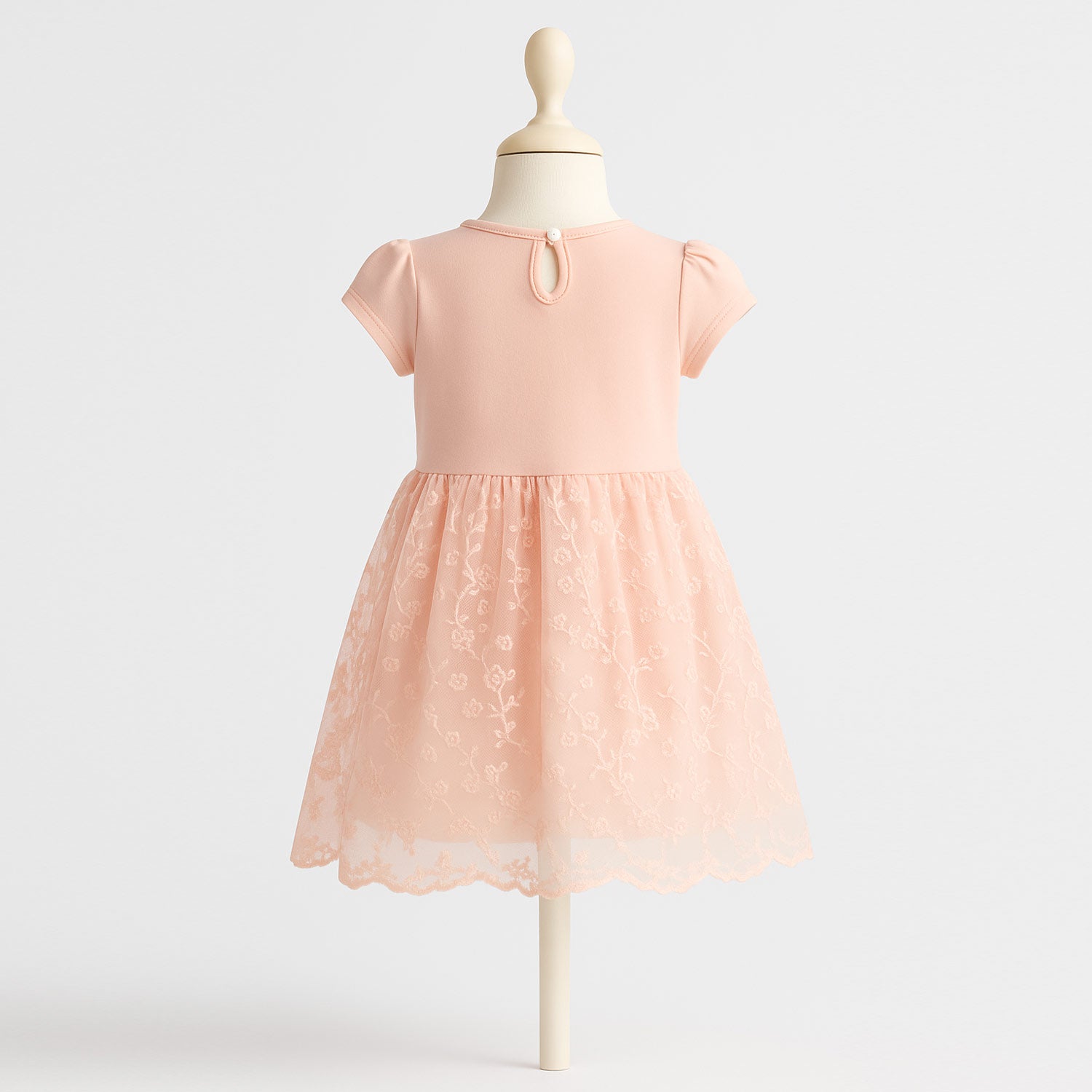 An ethereal dress for girls in apricot color, made of delicate lace. The short sleeve adds charm, and the elegant lace gives it a sophisticated style. The dress has a practical button closure at the back, which makes it easy to put on. The lack of pockets emphasizes its subtle and light character. Perfect for various occasions, a spring-summer proposition from the Breeze brand.
