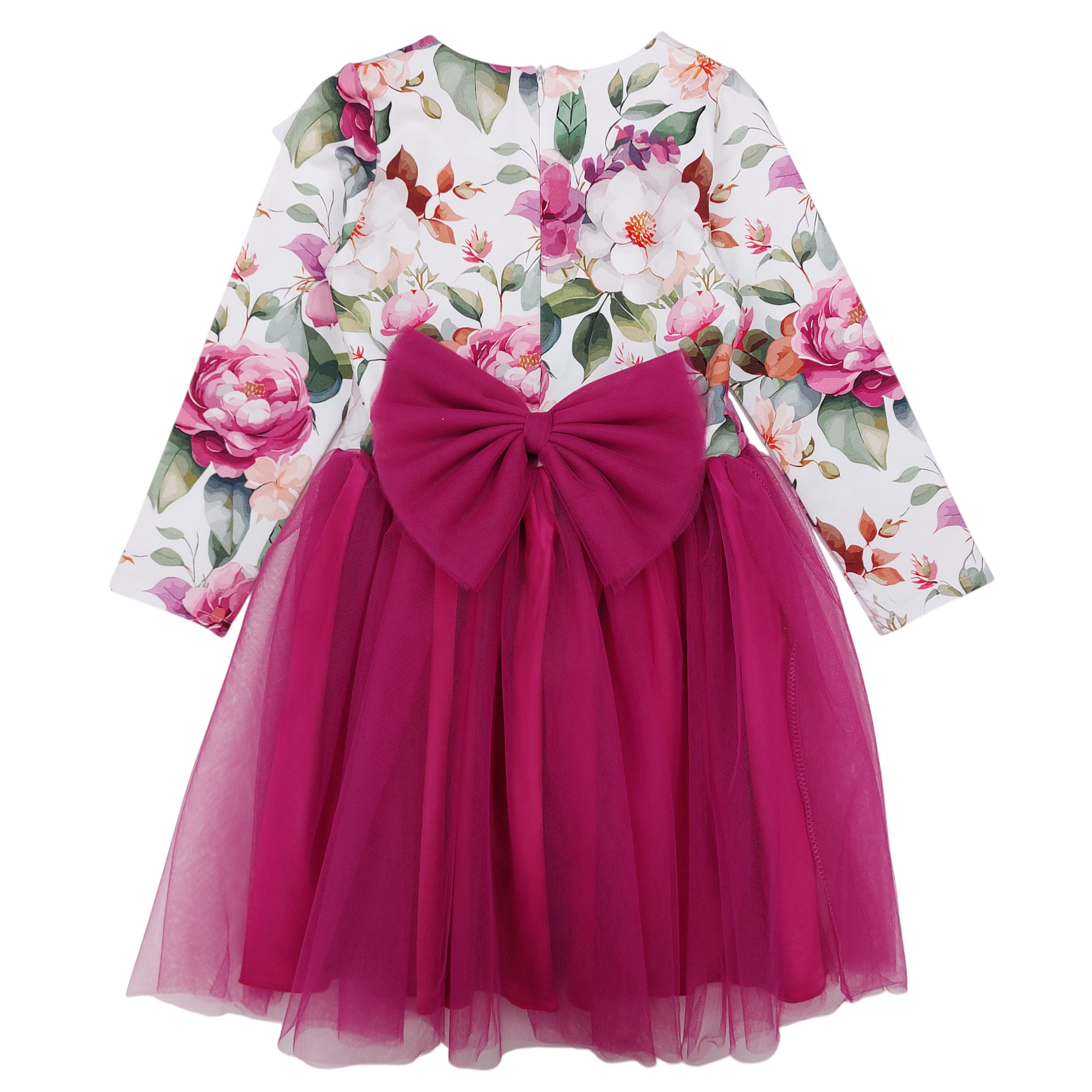 Katerina girl's dress in fuchsia color is a perfect choice for special occasions. The top of the dress is made of material in a floral pattern , while the bottom is decorated with an effective layered tulle skirt . The model has long sleeves and a large bow at the back, which adds elegance and charm. The dress is fastened with a hidden zipper at the back, which makes it easy to put on. Perfect for celebrations such as holidays, weddings or birthdays.