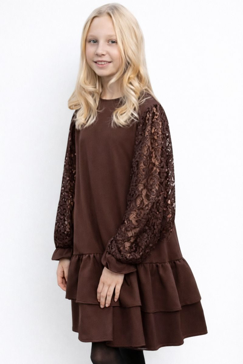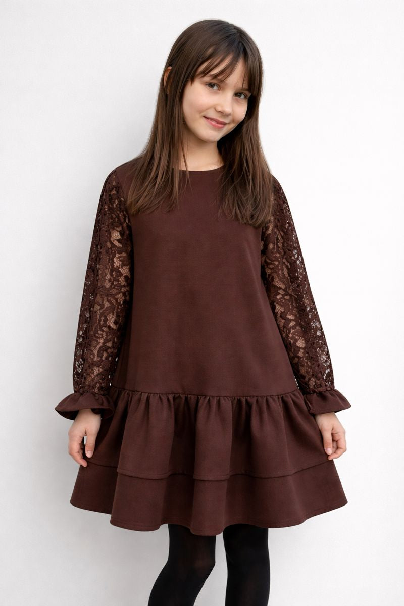 Elegancka sukienka dziewczęca z koronką w kolorze czekoladowym