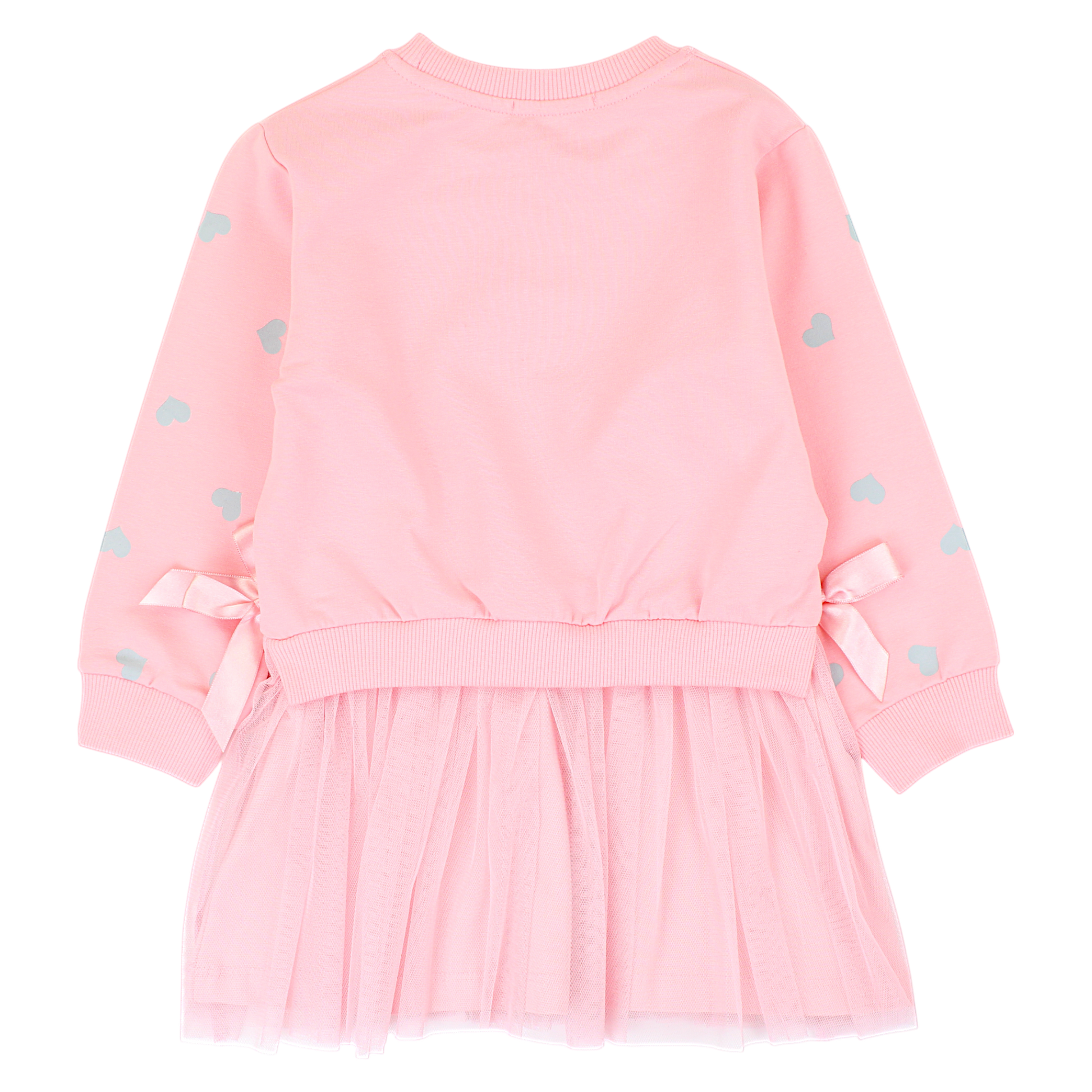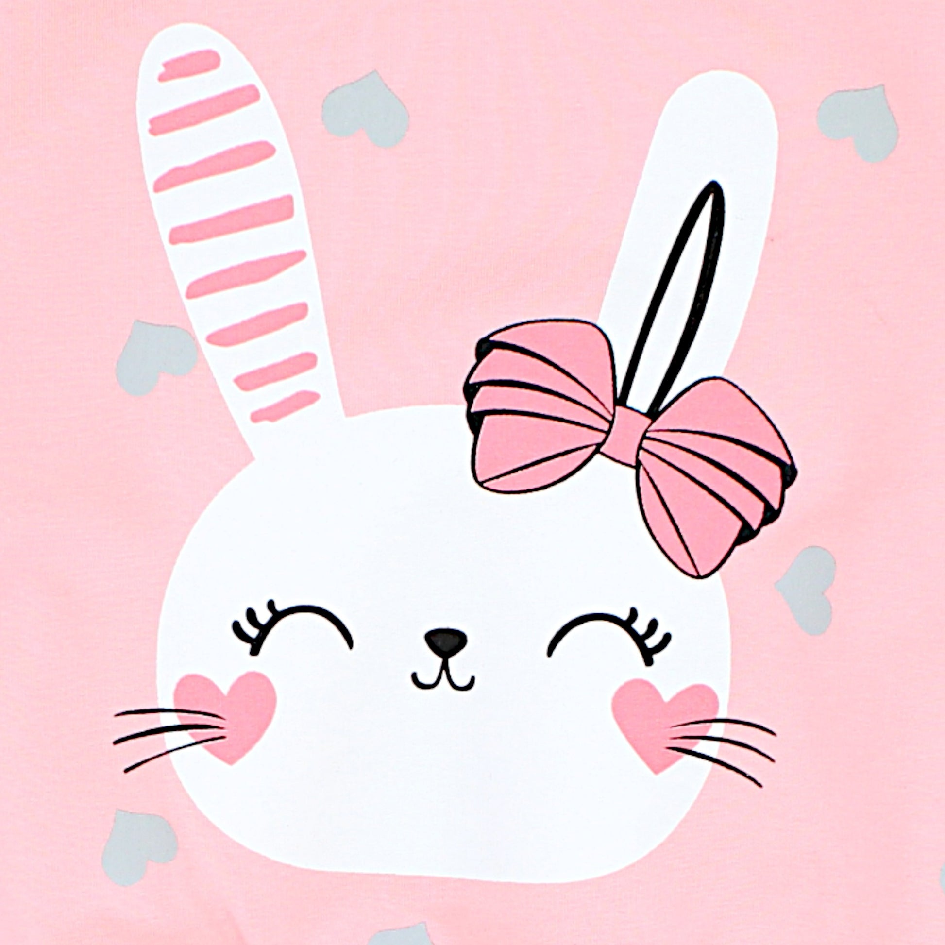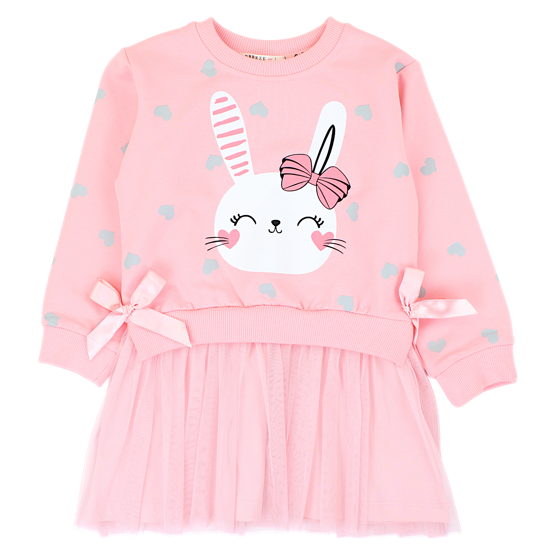 The top of the dress resembles long sleeve blouse , which provides the child with warmth and comfort. Decorated with a cute print bunny with a bow , will appeal to every little princess. Small little hearts on the entire surface of the material give it even more girlish charm. Tulle bottom gives the style lightness and makes the dress look elegant. On the sleeves there are decorative satin bows , which complement the whole and emphasize the delicate, girlish style.
