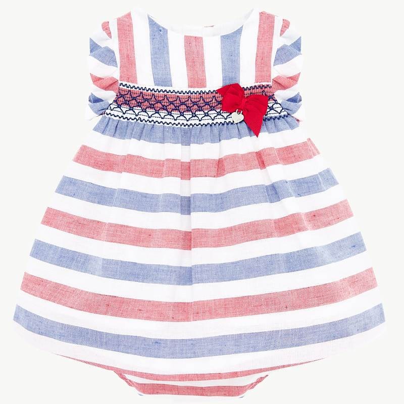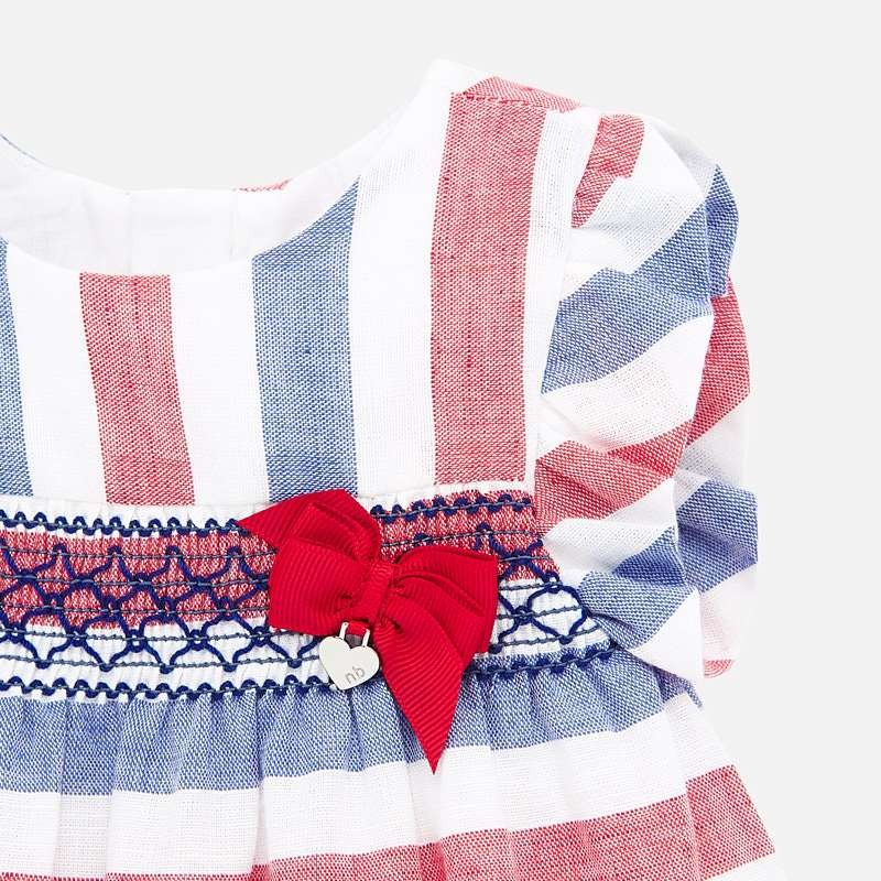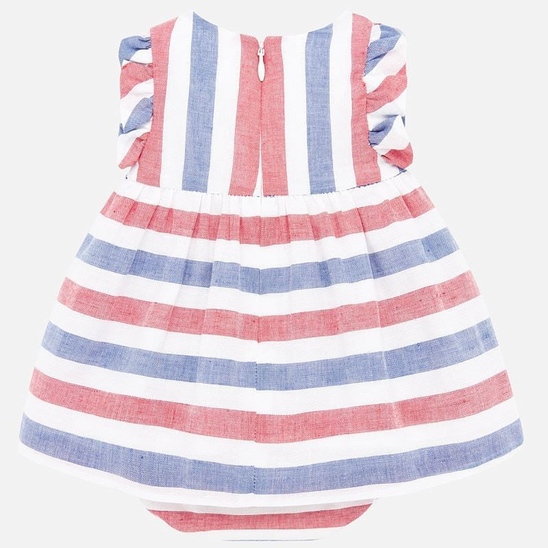 Children's linen dress with stripes, short sleeves, panties and decorative bow for girls Mayoral from the newborn girl collection from the spring summer season, product code 1879, color 39 Red. Clothing for newborns.