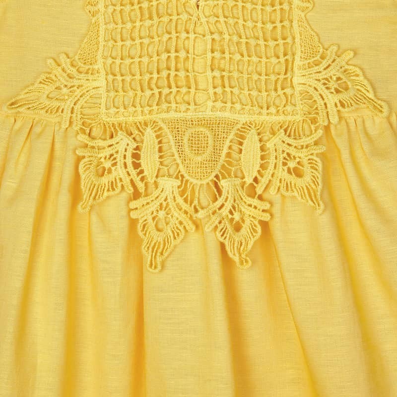Linen dress with guipure lace for children on straps with a ruffle for a girl Mayoral from the Mini girl collection from the spring-summer season, product code 3931, color 61 Mustard. Children's clothing.
