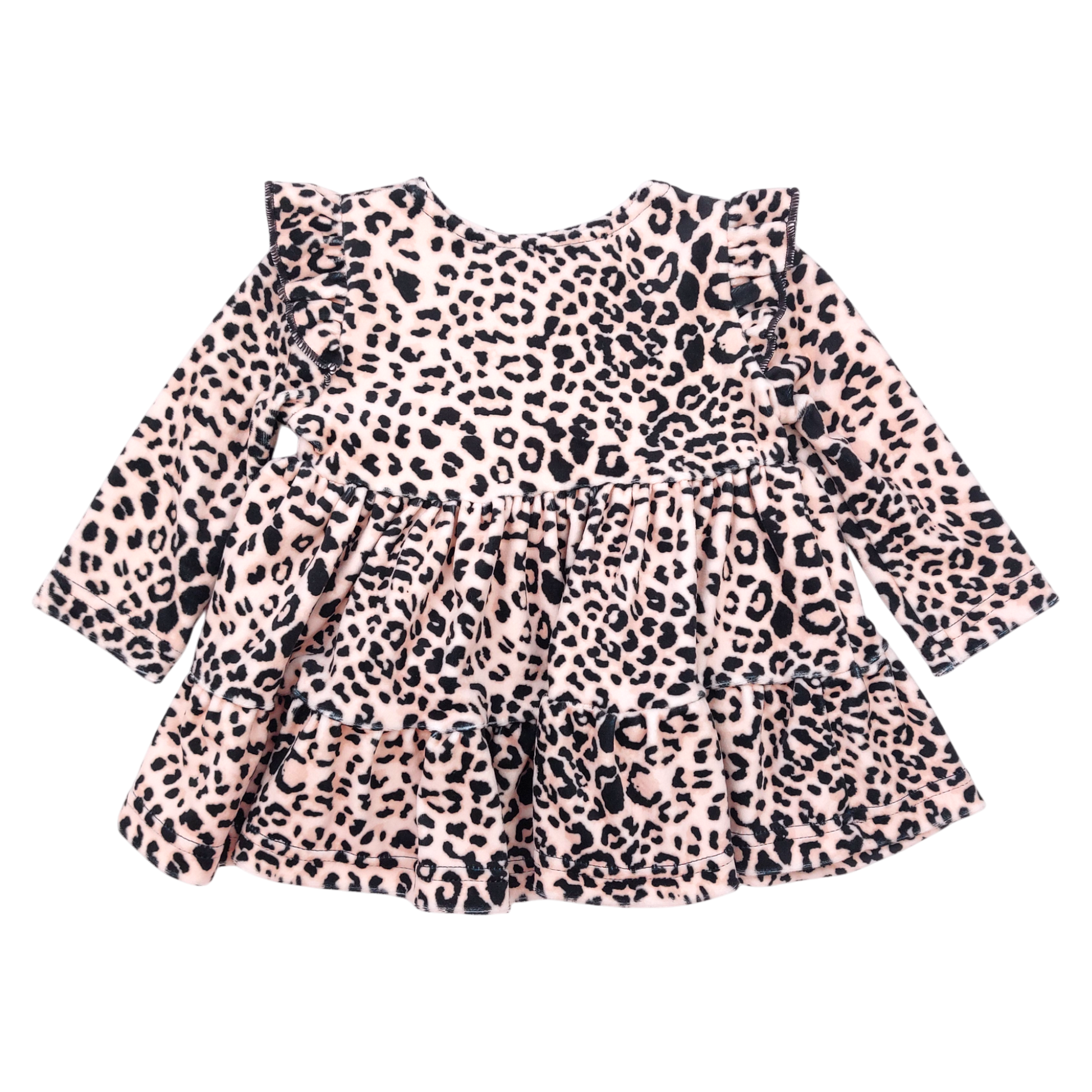 Stylish girl's dress in a leopard pattern , made of soft and pleasant to the touch velour. Model with ruffles at the shoulders and a decorative bow at the front. The dress has long sleeves and a flared bottom, perfect for autumn-winter stylings.