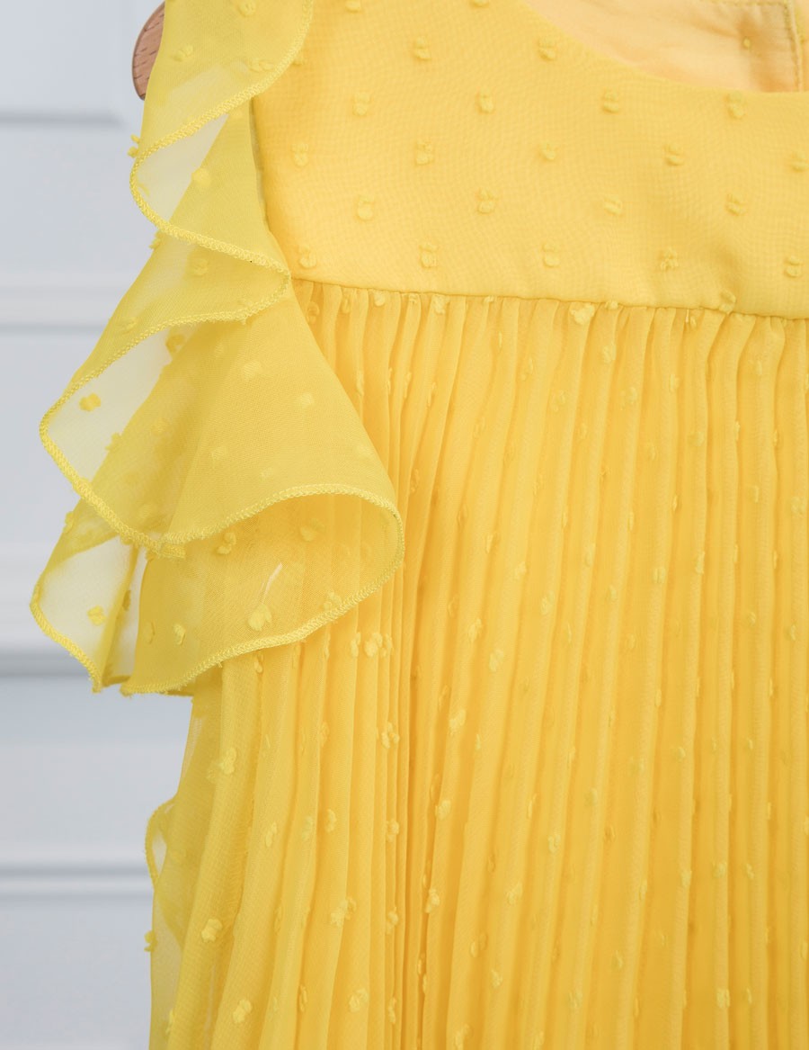 Elegant dress made of plumeti gauze for children, pleated, with ruffles on the sleeves, girl Abel & Lula from the collection Girl mini premium from the season spring summer, product code 5036, color 60 Yellow. Elegant clothes for children.