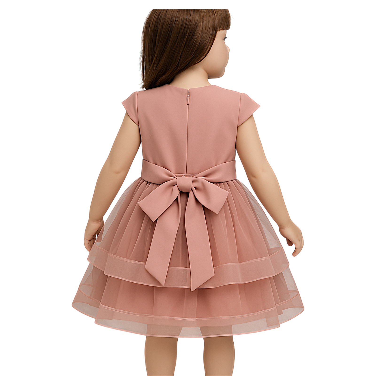 The front of the dress features a classic cut with a round neckline, perfectly emphasizing the innocence and grace of a child. The back zipper fastens, making it easy to put on and take off. A significant feature is the small, delicately gathered sleeves, which add even more charm. This girly dress is versatile and can be paired with a variety of accessories to create a memorable look for any occasion.