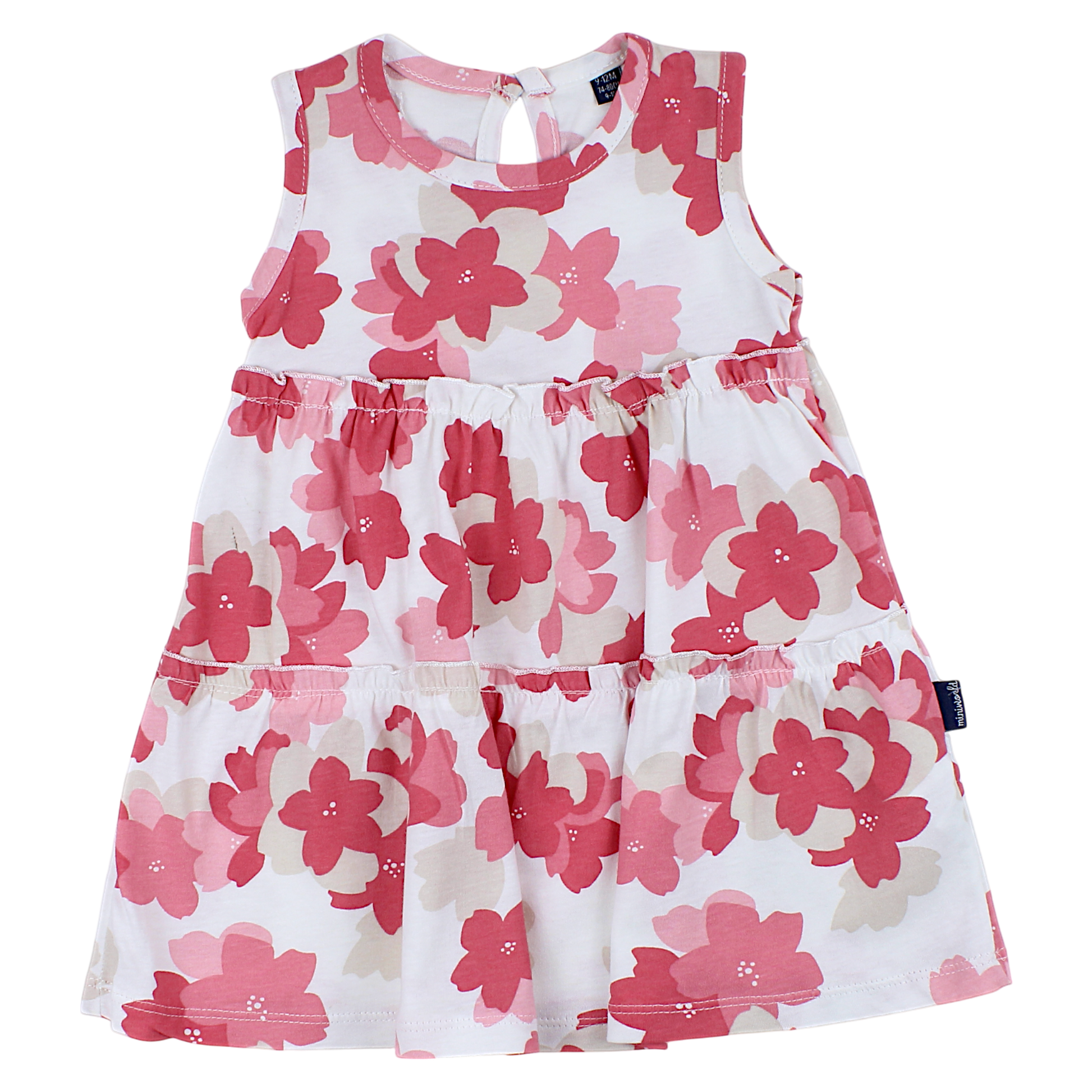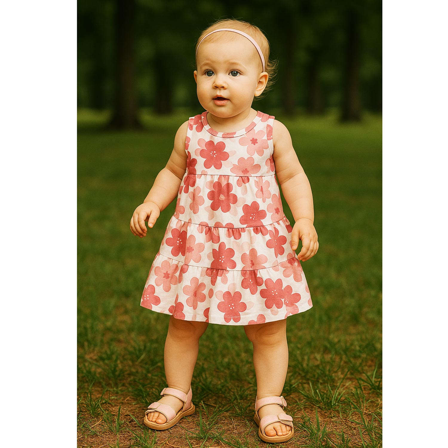 The dress's eye-catching details, featuring delicate floral patterns, add a unique charm and make your little one look exceptional. The knee- length dress allows for free play without worrying about comfort or mobility. The sleeveless design makes it a perfect choice for warm summer days, and its cut allows for complete freedom of movement.