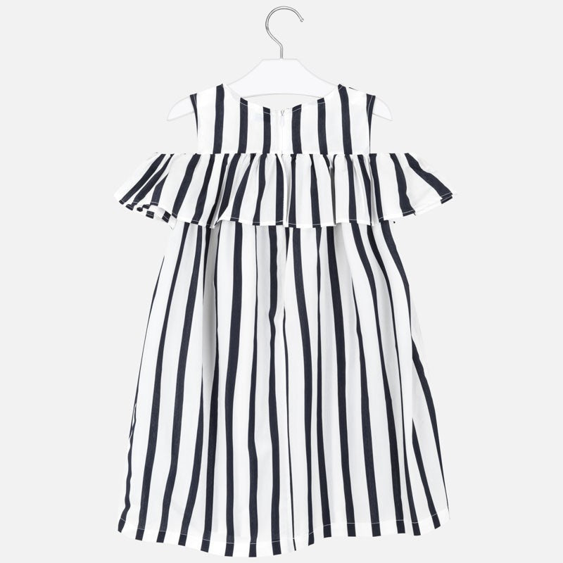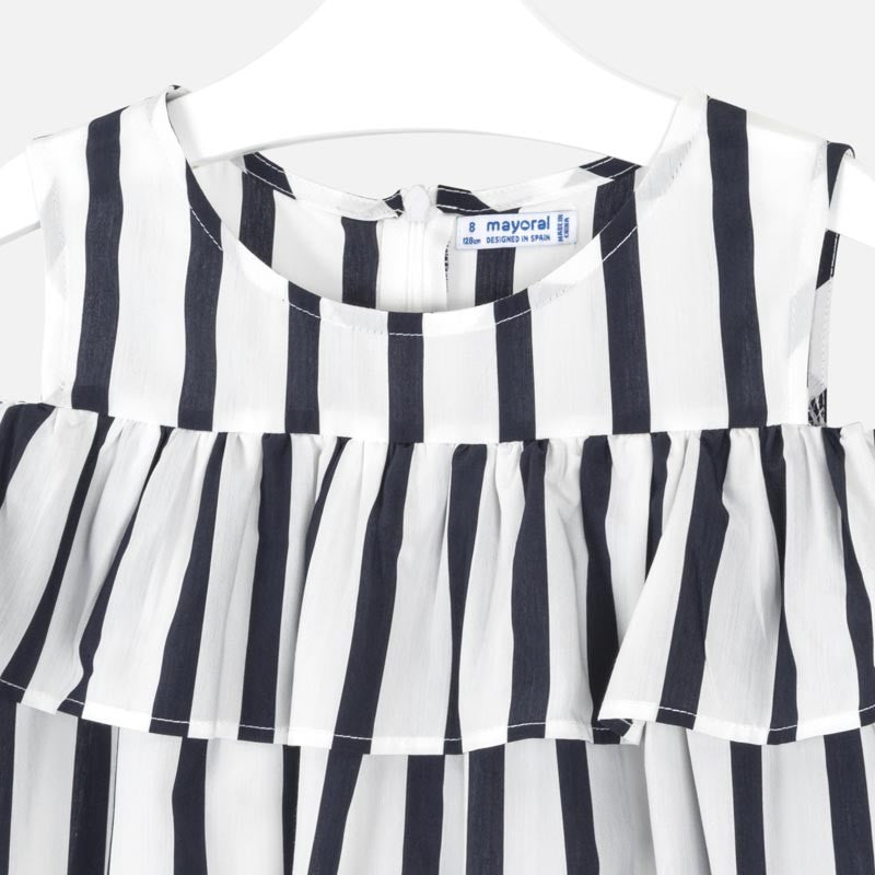 Children's striped dress with wide straps and ruffles for girls Mayoral from the junior girl collection from the spring summer season, product code 6964, color 42 Navy blue. Youth children's clothing.