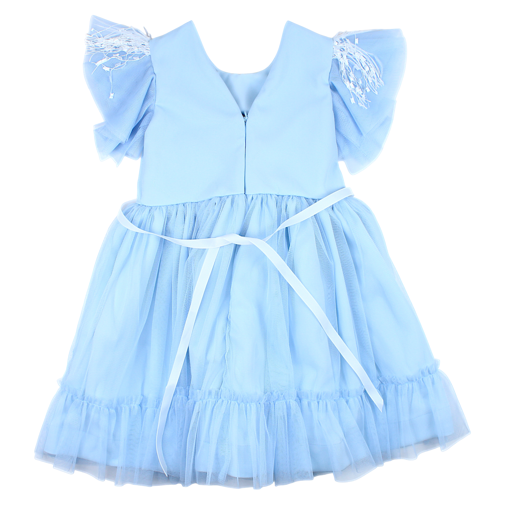 A beautiful formal dress for a girl in blue is the perfect choice for special occasions. Made of soft and skin-friendly fabric, it combines comfort and elegance . The charming floral motif decorating the front adds girlish charm and style to the dress. The top of the dress has delicate wing sleeves, and the entire bottom is finished with frills that gently rise with every step.