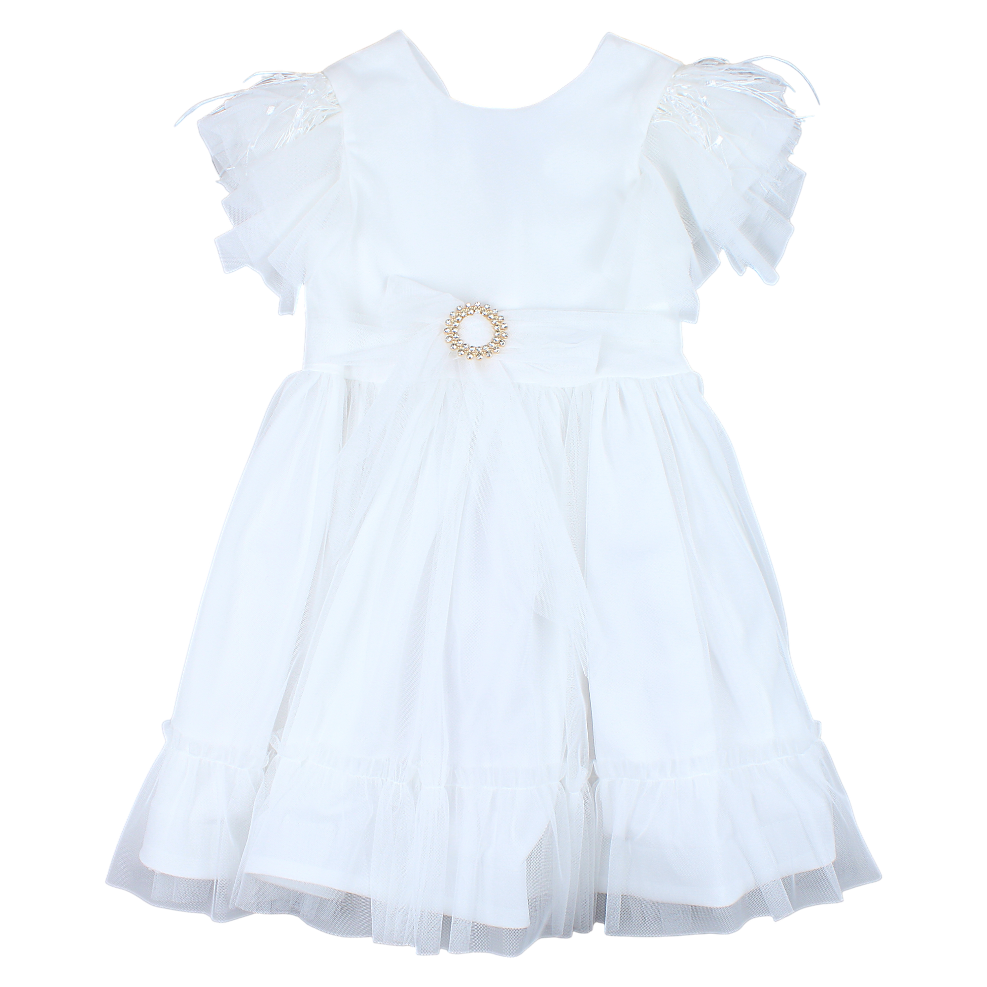 We present a charming formal dress for a girl in cream color . The dress is decorated with delicate feathers on the shoulders, which gives it a unique character. Made of soft material, it provides comfort of wearing. A decorative brooch in the form of a circle adds elegance. The dress has short sleeves and ruffles at the bottom. It is intended for children and is perfect for special occasions.