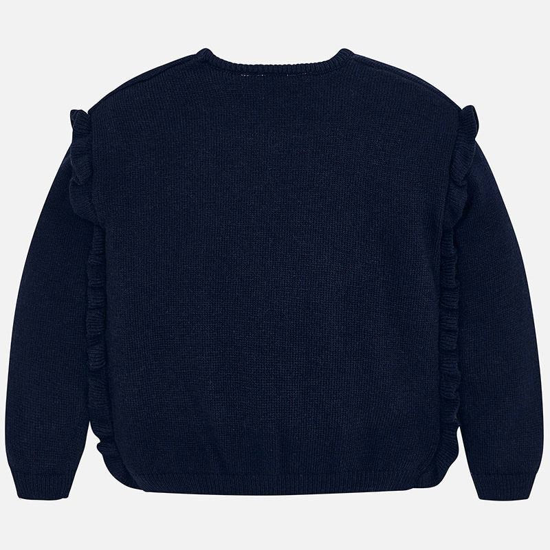 Mayoral children's clothing. Intarsia sweater with ruffles from the Mini girl collection from the fall winter season. Manufacturer's product code 4304 color 37 Navy blue.