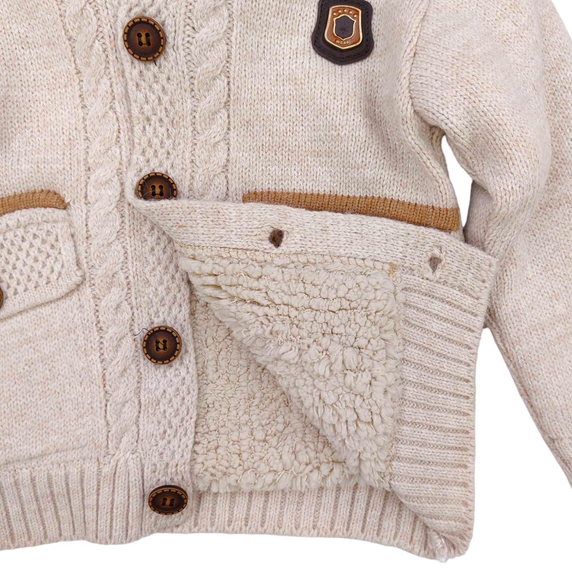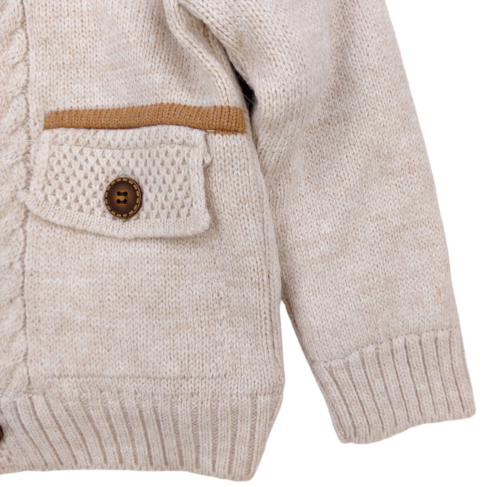 The sweater was designed with aesthetics and comfort in mind. The beige color gives it a universal character that perfectly matches other elements of the wardrobe. Decorative buttons in a contrasting shade of brown add additional charm, and details such as sewn-on pockets and a delicate braid pattern add a unique character. The stylish emblem on the chest is a subtle accent that gives the sweater chic.
