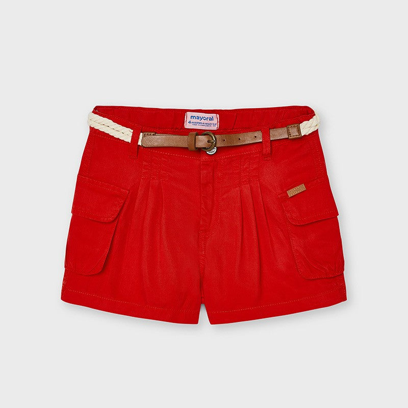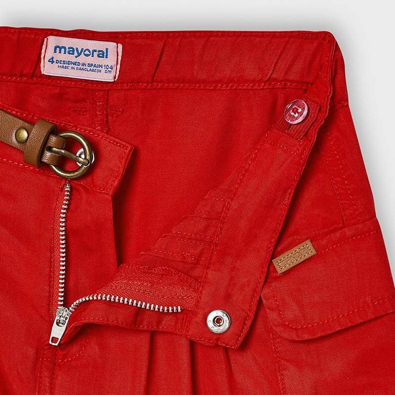 Children's thin shorts with pockets and a belt for girls Mayoral from the Mini girl collection from the spring-summer season, product code 3205, color 49 Red. Children's clothing.