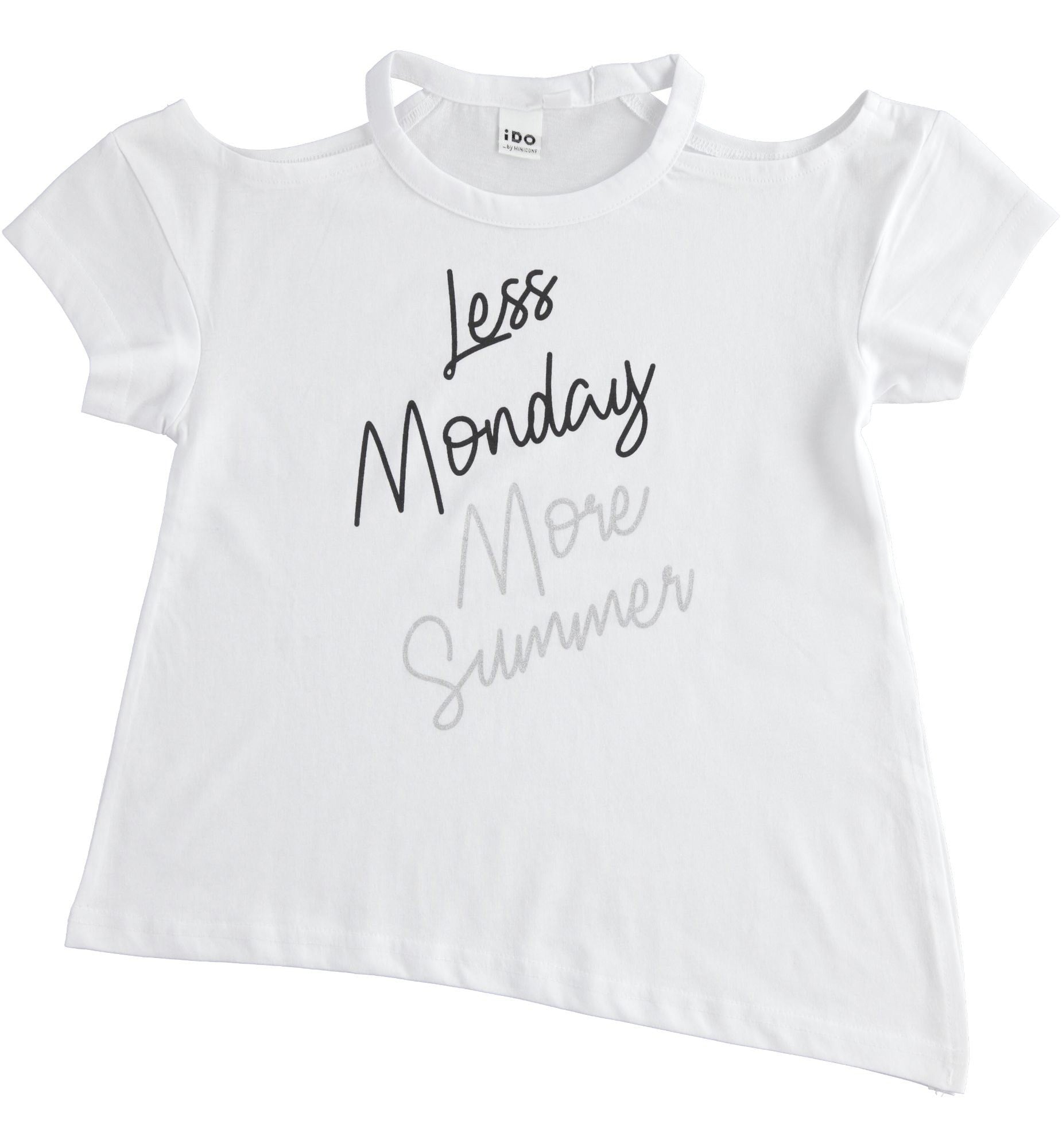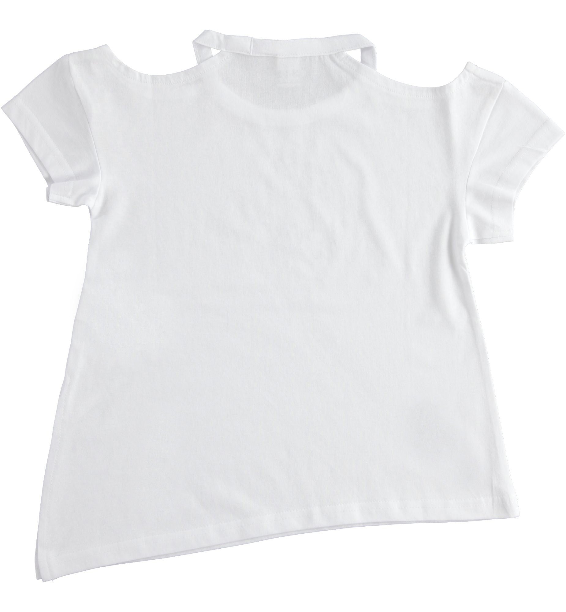 Children's cotton T-SHIRT with cutouts on the shoulders and a delicate inscription on the front for girls iDO from the spring summer collection product code J889 color 0113 white. Children's clothing.