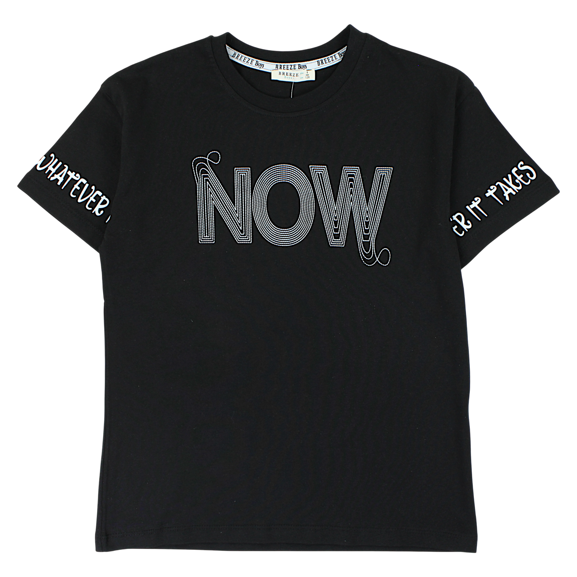 A fashionable boy's T-shirt by Breeze with an eye-catching NOW print on the front. Classic cut, with a round neckline and short sleeves , decorated with a stylish print on the sides: "WHATEVER IT TAKES". The black T-shirt is the perfect choice for everyday wear , matching various styles - both jeans and sports sweatpants . Soft, breathable cotton ensures comfort all day long.